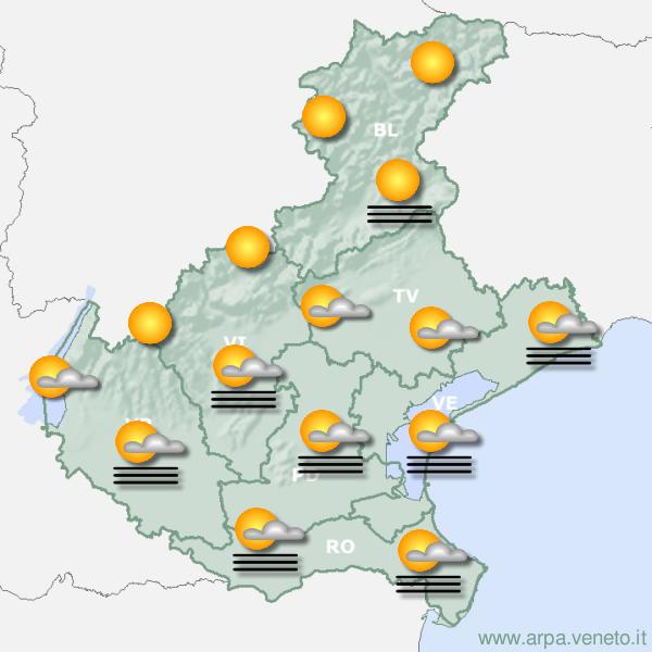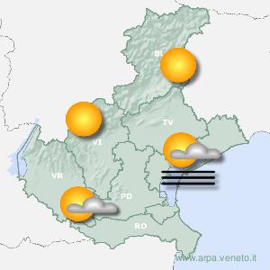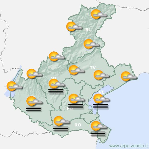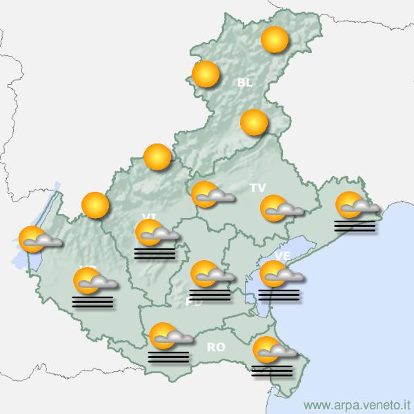 venerdì 12. Non si verificheranno precipitazioni. Cielo sereno o poco nuvoloso. Nei bassi strati nebbie di notte specie a sud dell'asse Verona-Treviso, in dissolvimento di mattina e in nuova formazione di sera. Temperature in calo. Previsore: Stefano Veronese