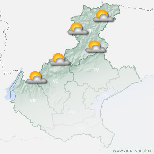 Parzialmente soleggiato con nuvolosità in aumento nel tardo pomeriggio-sera per transito di nubi alte e addensamenti specie su Prealpi ma generalmente innocui. Venti deboli settentrionali in quota, a 10-20 km/h a 2000 m e 10-25 km/h a 3000 m; brezze nelle valli. Temperature massime generalmente stazionari; Prealpi - a 1500 m: max 12, a 2000 m: max 8. Dolomiti - a 2000 m: max 9, a 3000 m: max 0