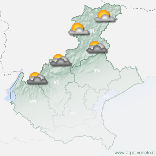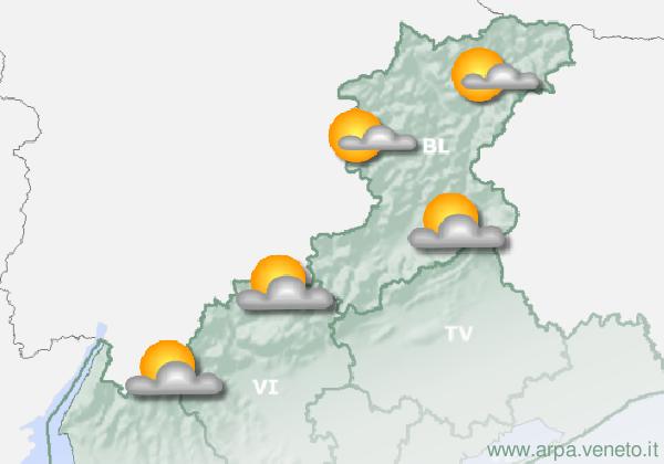 Su Dolomiti sereno o poco nuvoloso in quota con qualche annuvolamento verso sera, nubi qua e là su fondovalle di Cadore, Comelico e basso Agordino. Su Prealpi nuvoloso con qualche irregolare schiarita. Precipitazioni: non del tutto esclusa a tratti un pò di pioviggine (10%) nei settori interessati da nubi basse. Temperature in lieve calo Su Prealpi - a 1500 m: max 9, a 2000 m: max 5. Dolomiti - a 2000 m: max 8, a 3000 m: max -2 Venti nelle valli generalmente deboli per brezze; in quota deboli da nord-ovest, in rotazione a nord,