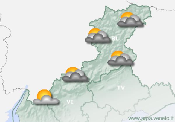 La depressione responsabile del peggioramento di domenica ha esaurito i sui effetti e lunedì trasla dall'Europa centrale verso est, lasciando spazio ad un aumento del geopotenziale, collegato alla zona di alta pressione centrata sulla Penisola iberica, e a correnti dapprima settentrionali, poi orientali. Ciò determinerà giornate maggiormente soleggiate sulla montagna veneta, ma con tratti di variabilità specie sulle Prealpi.