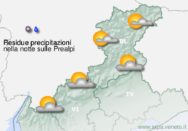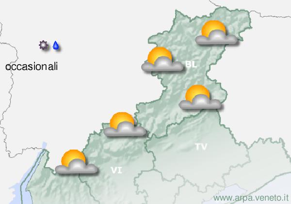 Peu nuageux - Précipitations: éparses aussi avec averses - Probabilité: 30% - Altitude neige: Au-dessus de 1300-1500 m